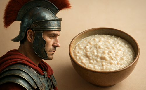ローマ兵の食事といえば「硬いパンをかじってワインを流し込む」みたいなイメージが定番だけれど、実は彼らが日常的に食べていたのは高タンパクの粥だった、という事実はあまり語られません。というのも、軍事史の主役はいつだって戦術や英雄譚で、兵士たちが何を食べていたかなんて細かい生活記録は後回しにされがちだったからです。さらに、粥という素朴すぎる料理は「強い戦士の象徴」としては地味すぎて、後世の文献や絵画でもほとんど取り上げられず、結果として“プロテイン粥”は歴史の表舞台から静かに姿を消してしまったのです。